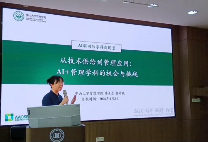 管理学院2024级博士研究生郭希婕带来《从技术供给到管理应用:AI+管理学科的机会与挑战》的报告。她从技术供给与企业应用两个维度切入,介绍了AI驱动的商业模式创新与创业机会,剖析了AI在企业管理场景中的落地实践,系统解析了AI与管理学科交叉融合的核心机会与现实挑战,帮助师生理解人工智能与管理融合所催生的新问题与新空间。